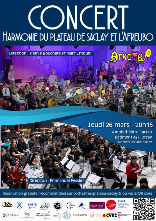 L’Harmonie du Plateau de Saclay et l’Afreubo unissent leurs énergies pour un concert exceptionnel où se rencontreront puissance orchestrale et finesse musicale. Portée par son esprit innovant, l’Harmonie du Plateau de Saclay offrira des arrangements modernes et audacieux, tandis que l’Afreubo, forte de son identité chaleureuse et festive, apporterá son style dynamique et généreux. Ensemble, ils proposeront un voyage musical vibrant, mêlant musiques de films, rythmes latino, jazz, pop et grands classiques revisités. Un programme varié, entraînant et surprenant, qui promet de faire vibrer tous les publics. Ne manquez pas ce rendez-vous musical unique ! Le 26 mars 2026 à 20h, à l'amphi Cartan (Bât 427) à Orsay. Entrée libre (limitée à 500 places), réservation recommandée sur : https://orchestres-plateau-saclay.fr/reservation/